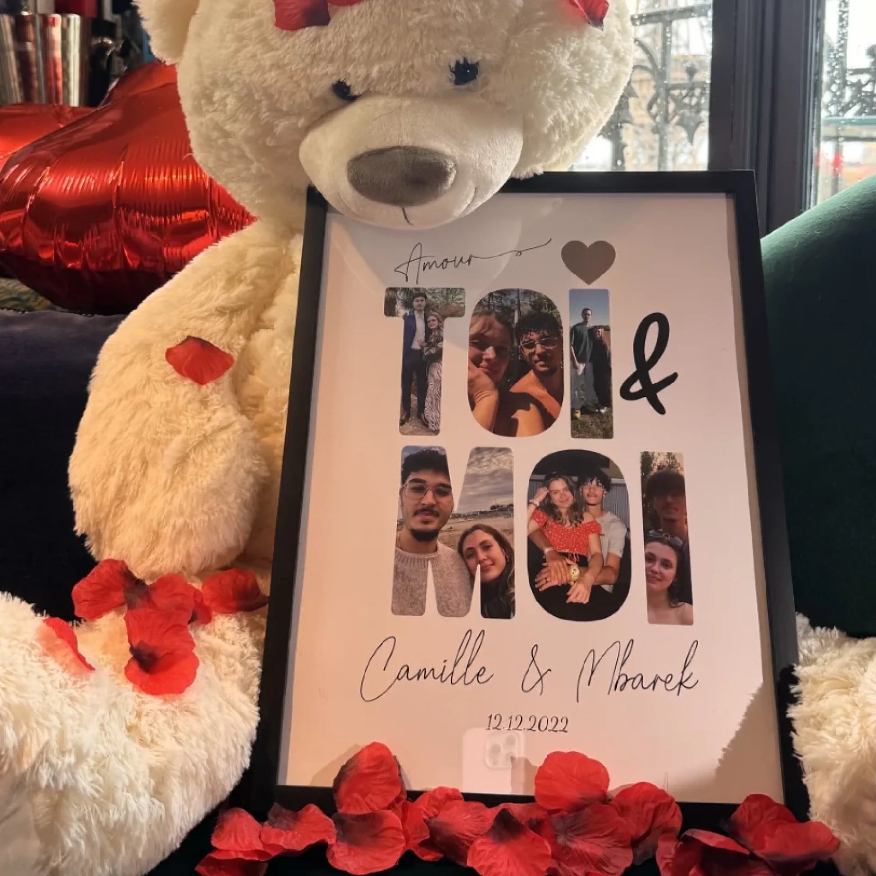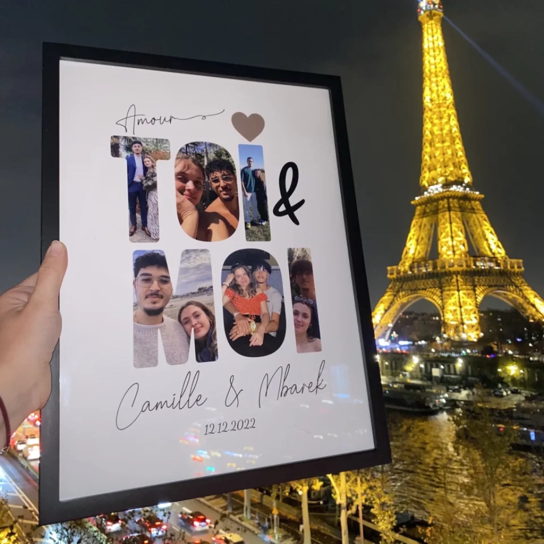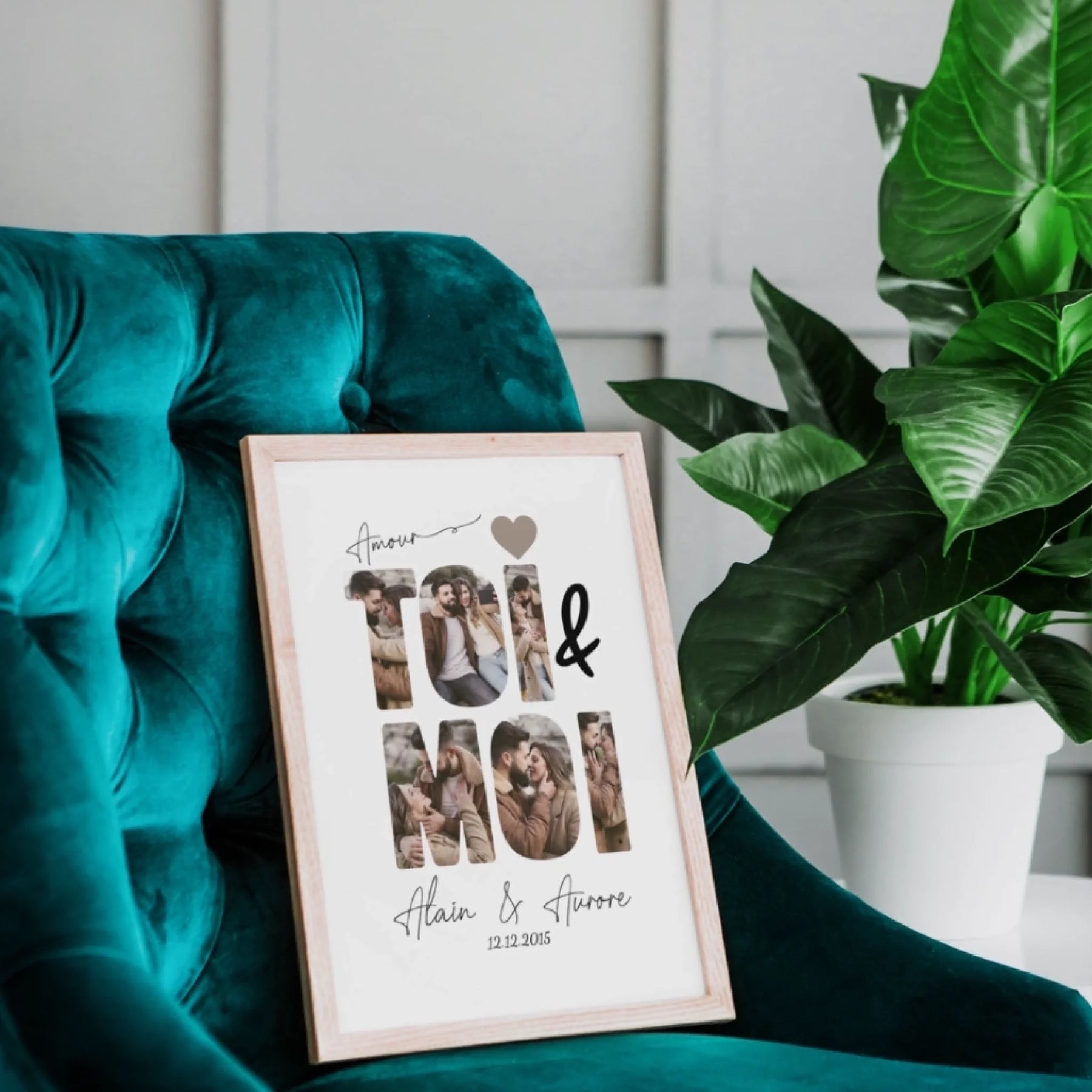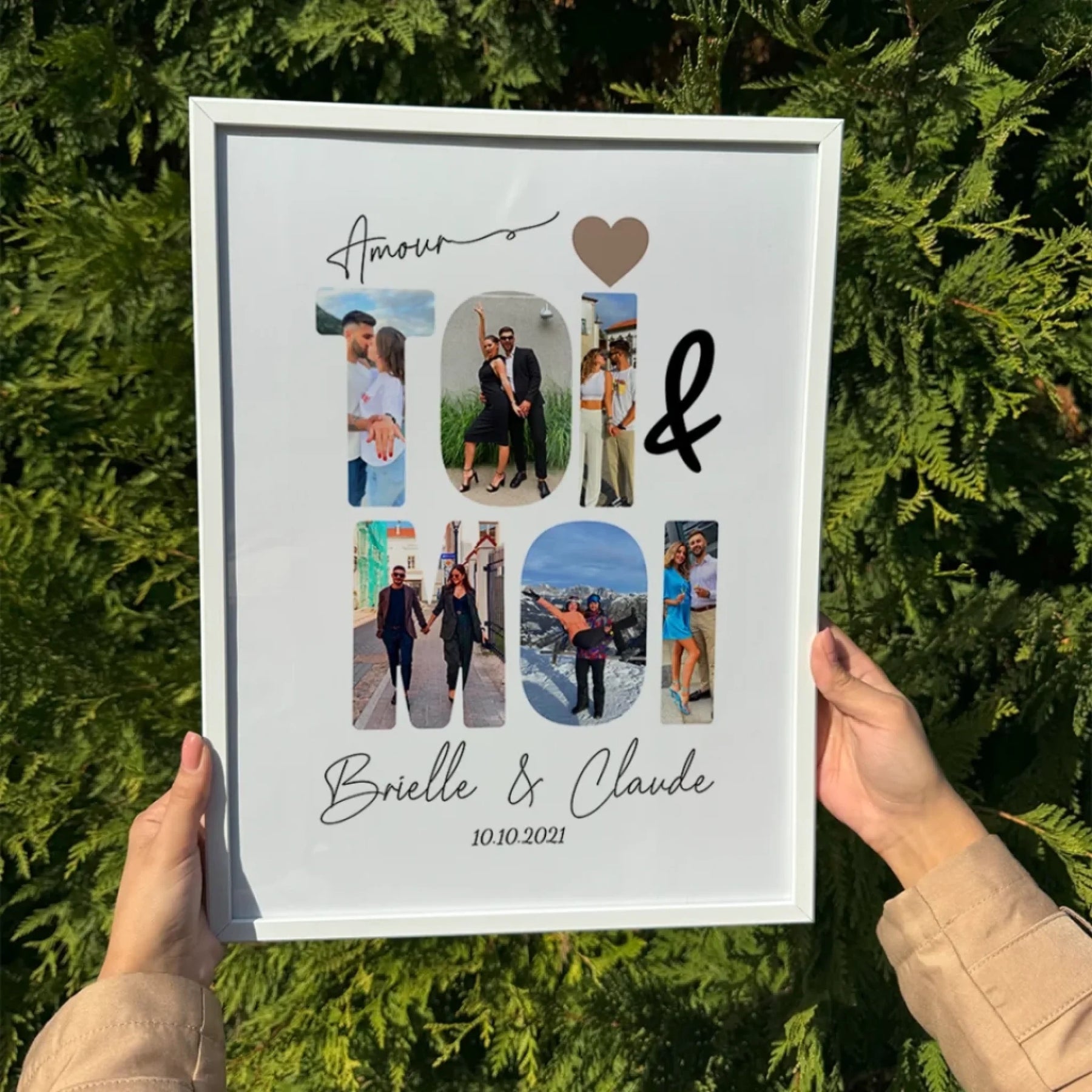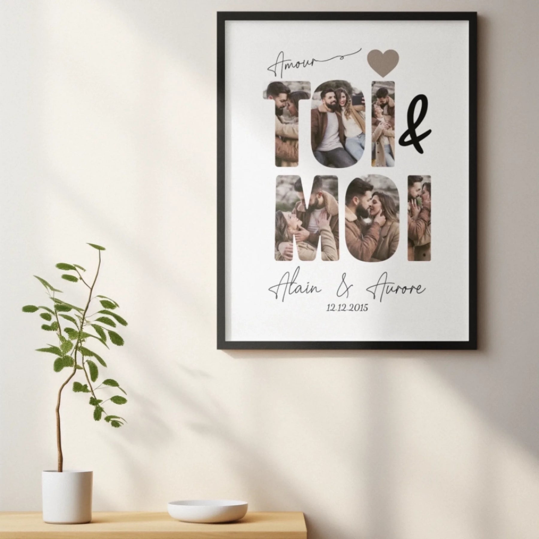 Immortalisez votre histoire d'amour avec notre affiche personnalisée "Toi & Moi". Cette pièce charmante et romantique capture parfaitement l'essence de votre relation à travers une collection de vos moments les plus mémorables ensemble. Chaque photo est artistiquement placée à l'intérieur des lettres "TOI & MOI," symbolisant l'unité et le lien éternel entre vous deux.